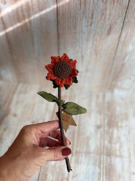 Sunflowers With Real Twig Stems, Crochet Sunflowers Real Twig Stem Details, Handmade Crochet Sunflower, Rustic Crochet Sunflower