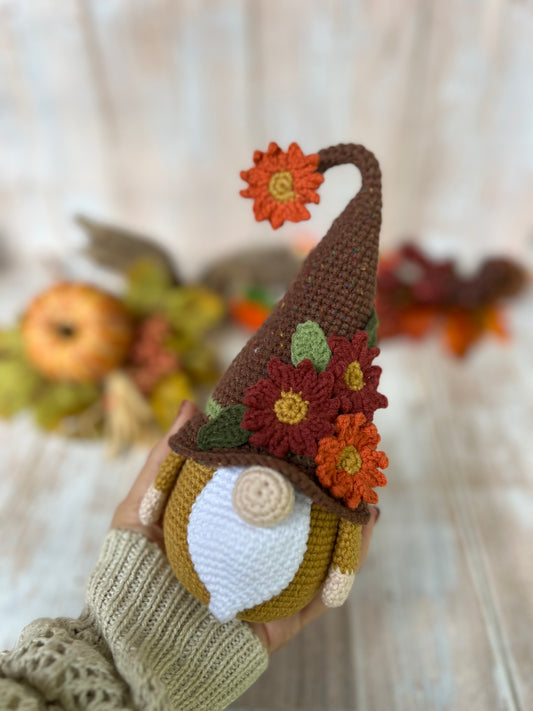 Harvest the Fall Gnome with Brown Hat and Flowers, Handmade Fall Decor, Ready Made, Unique Fall Gnome