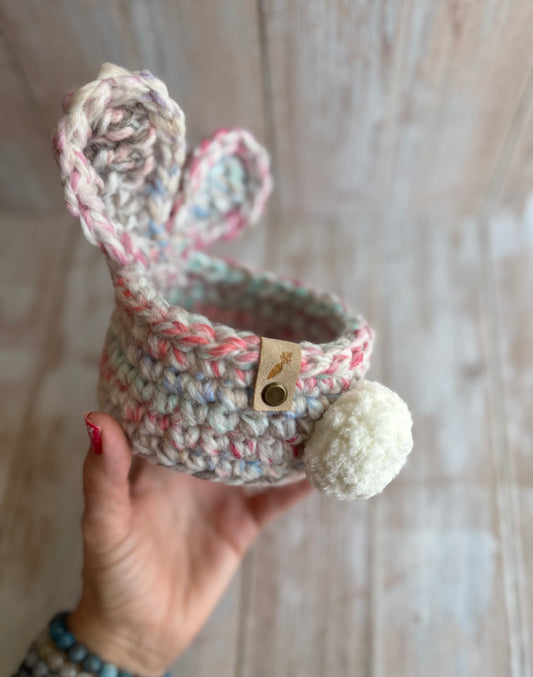 Handmade Bunny Ear Crochet Basket, Easter Bunny Storage Basket, Whimsical Bunny Tail Basket, Pastel Bunny Basket – Cute & Cozy, Chunky Crochet Bunny Basket