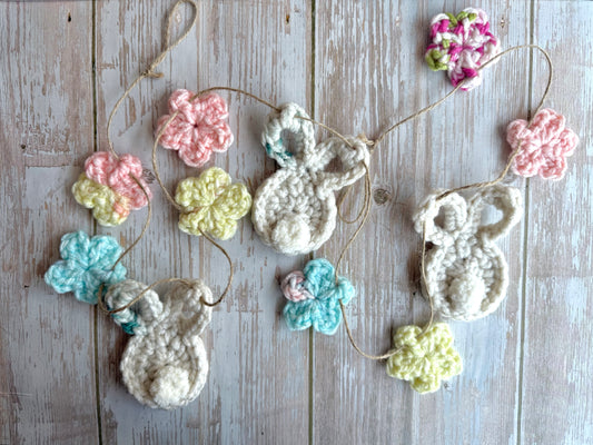 Handmade Spring Bunny & Flower Garland, Crochet Bunny & Blossoms Garland – Spring Decor, Pastel Easter Bunny Garland – Handmade Crochet