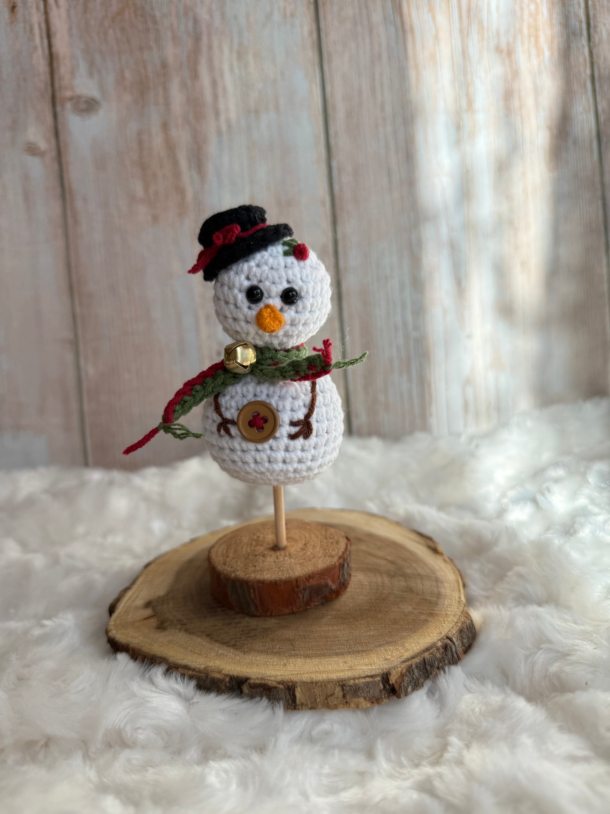 Crochet Snowman on Wood Stand Handmade Winter Decor, Handmade Crochet Snowman with Hat & Scarf Christmas Table Decoration, Amigurumi Snowman Ornament Cozy Winter Home Accent, Crochet Snowman Figurine Rustic Holiday Decor on Wooden Base