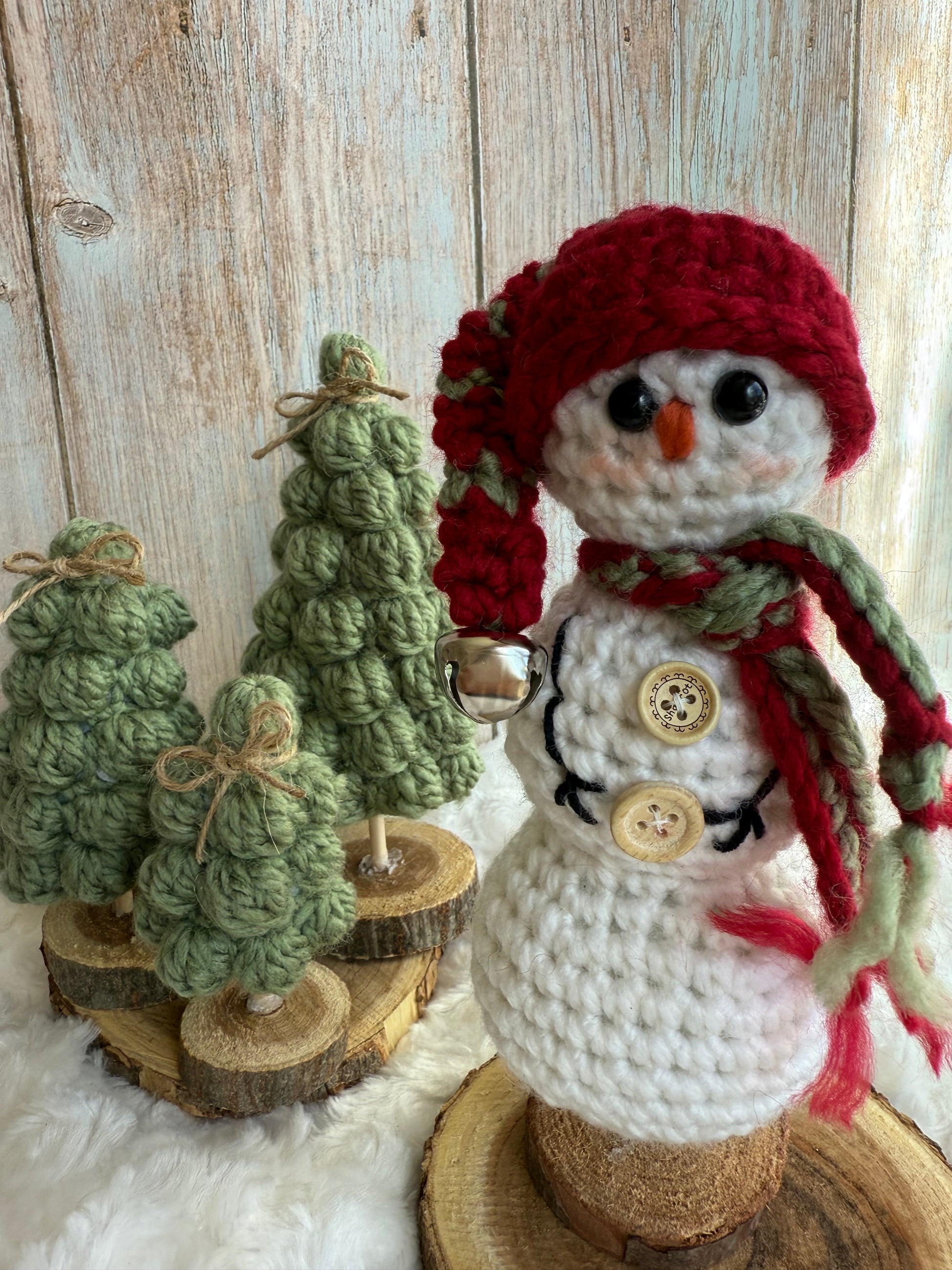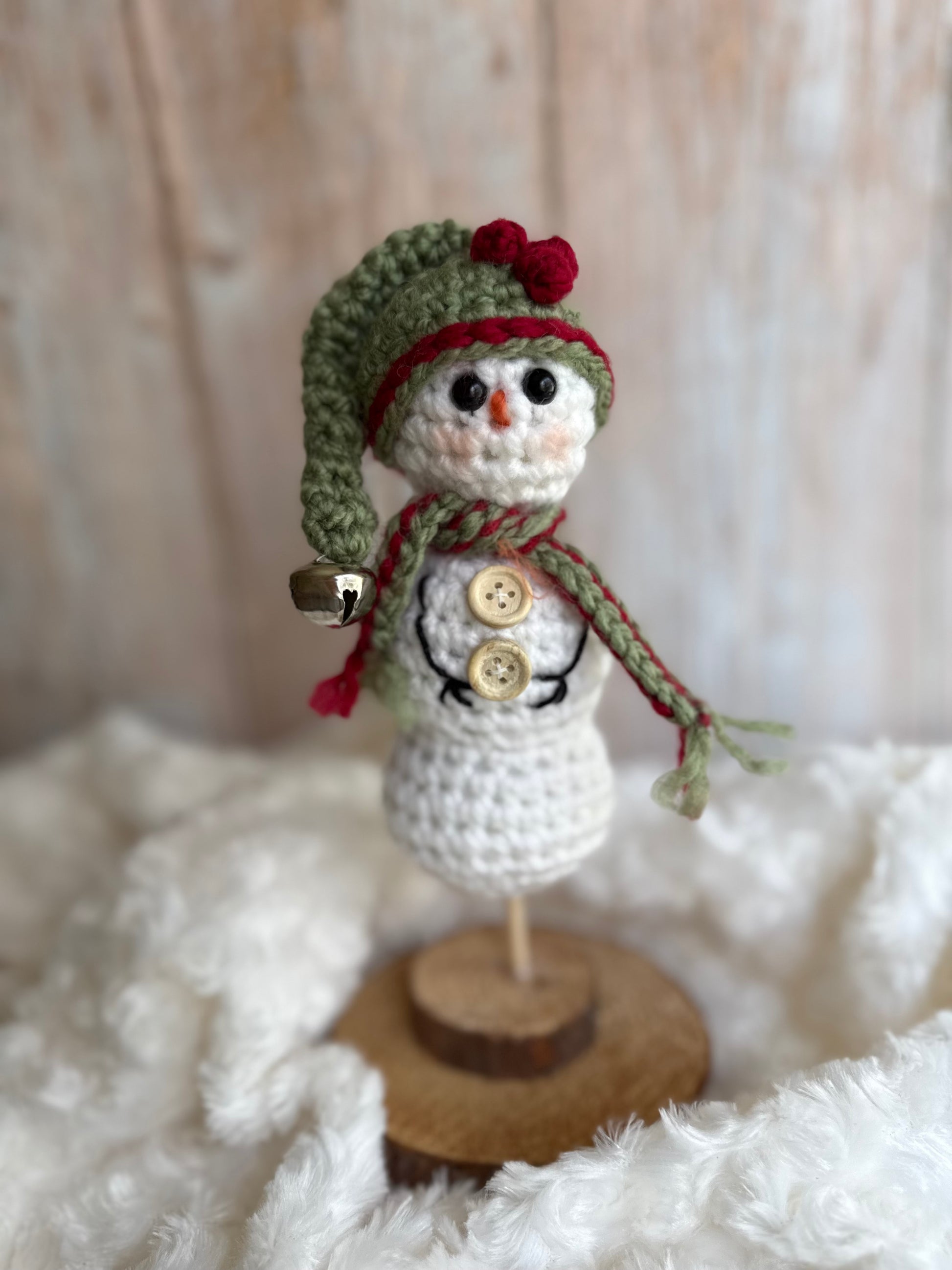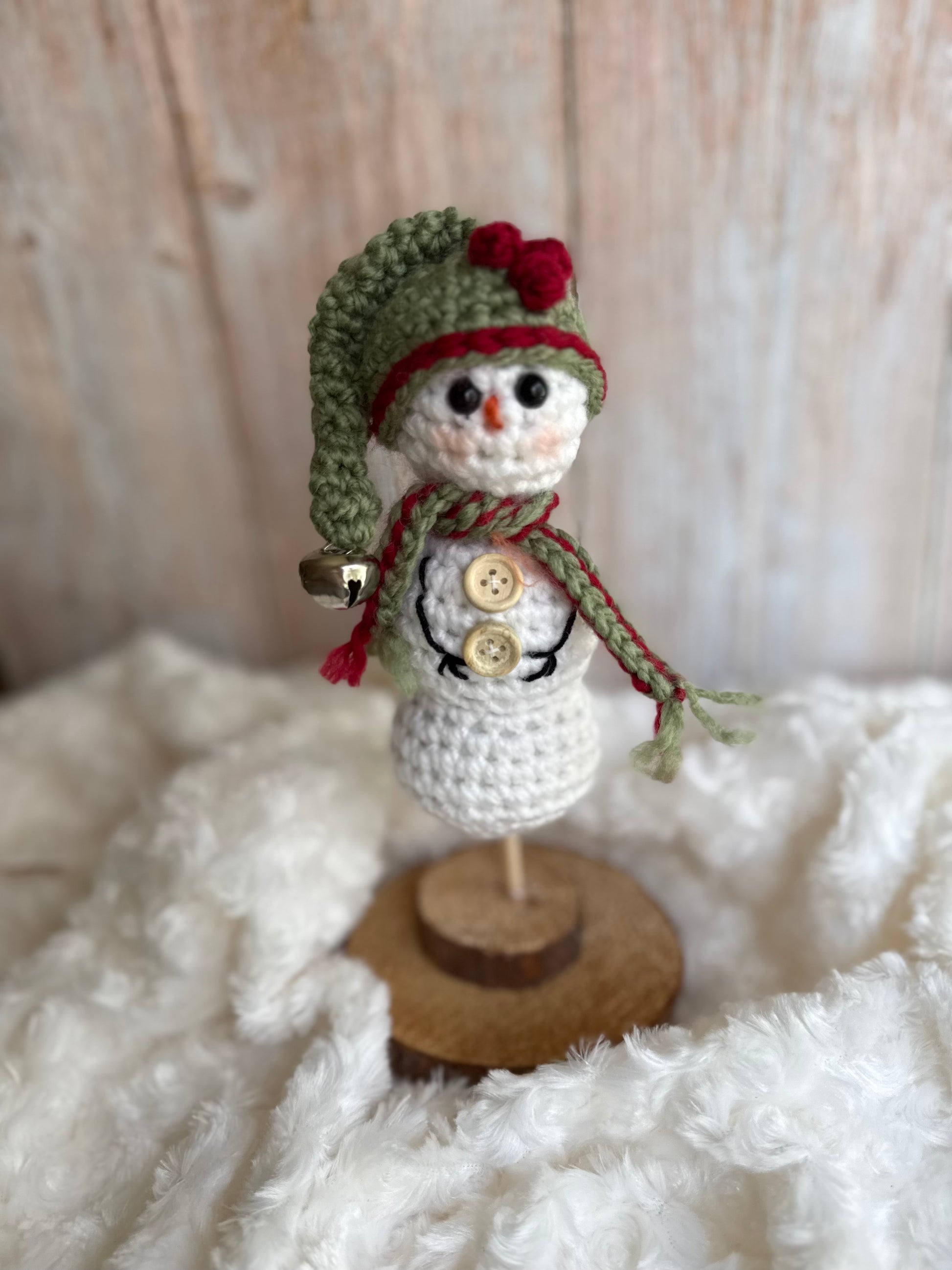Handmade Crochet Snowman with Hat and Scarf – Winter Table Decor, Crochet Snowman on Wooden Base – Cozy Rustic Christmas Decoration, Mini Crochet Snowman – Cute Handmade Holiday Figurine, Crochet Snowman with Button Details – Perfect Winter Gift