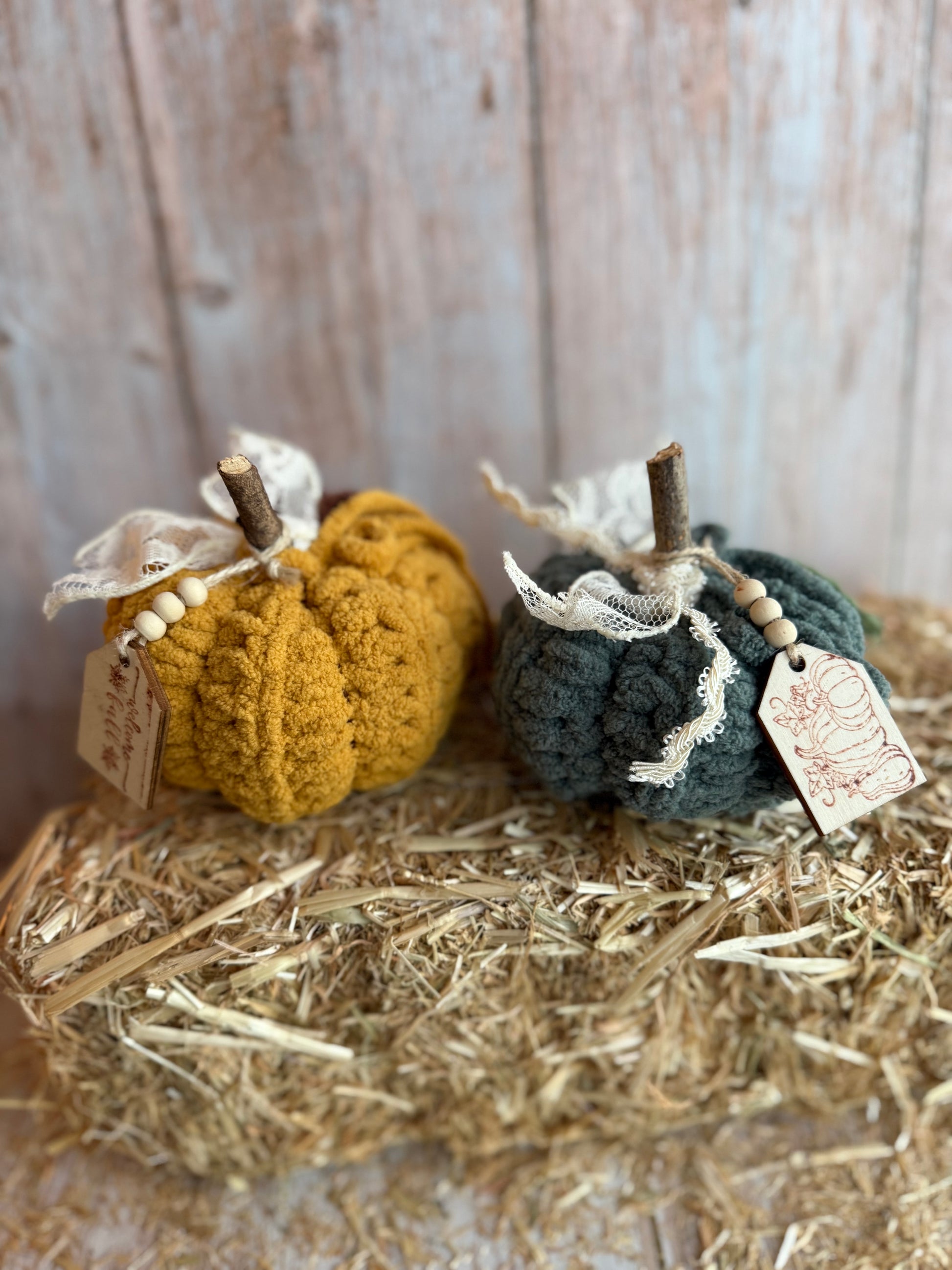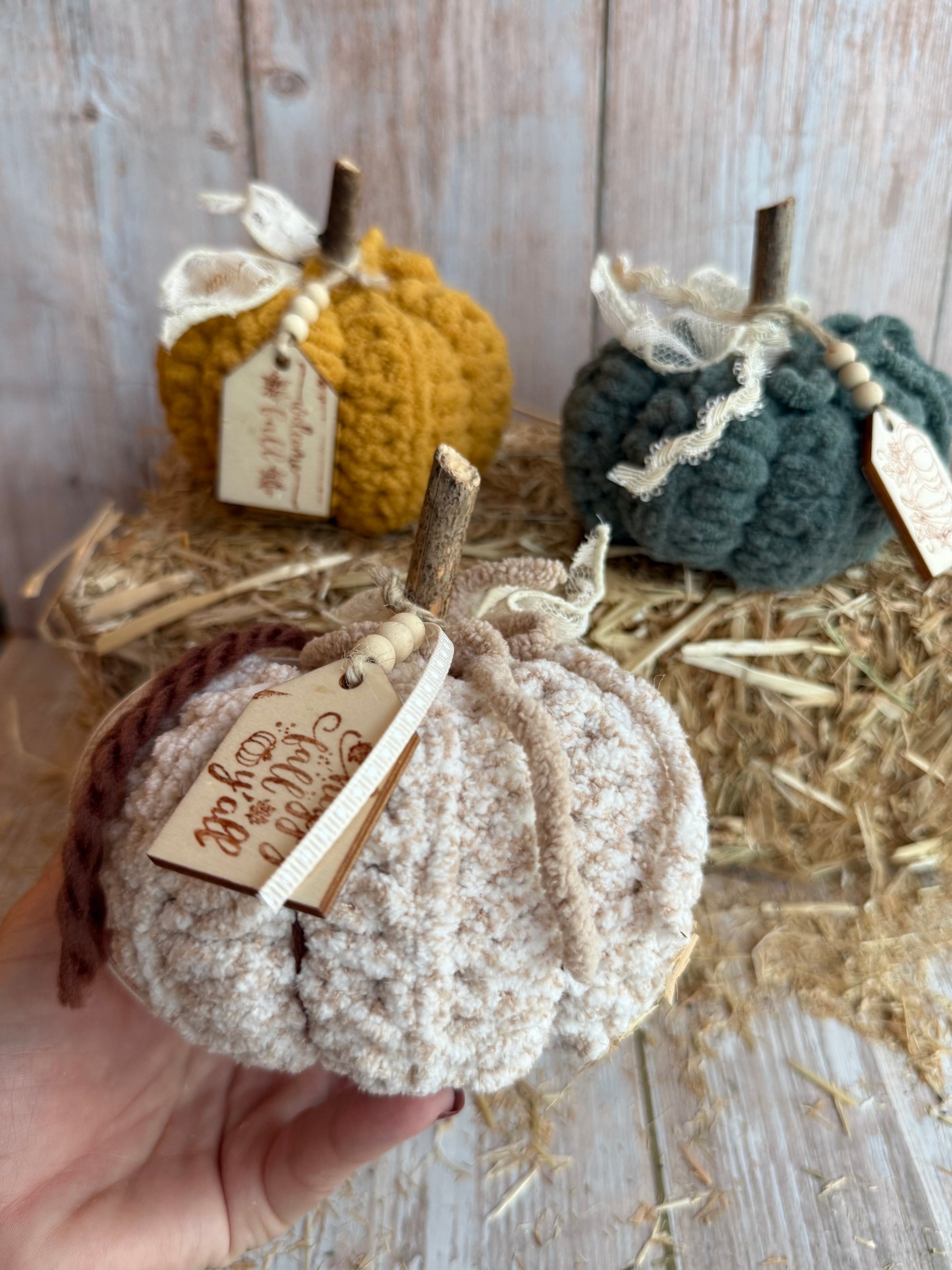 🍂 Crafted in soft mustard, beige, and teal, each pumpkin comes in various sizes and features a rustic wooden stem for a natural touch. The stems are beautifully adorned with delicate lace, tiny fall tags, and twine, adding charming seasonal details perfect for tiered trays, mantels, or table displays.